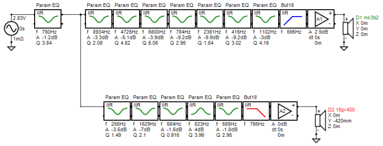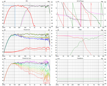 Adding on a fronthorn length and throat chamber length goes into the resonant circus, too, but here you sidestepped some ugly MR ringing by using the big throat (St > Sd). I didn't see that yesterday and just blindly assumed that all the wood gnawed-out was for a conical front chamber volume to lowpass everything acoustically--figured you guys already hashed that out and did it to eat HF from the woofer, etc. Strictly-speaking, I also messed-up the throat chamber which, in this specific model, should have been put in the RC entry as Vrc 2.5 and Lrc 2.92 with Vtc=Atc=0 so it went in the right place, but the big throat mostly negated the mistake.